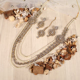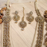 Diamond cluster rani haar set with 3 pearl tiers. Item comes with matching earrings and tikka