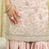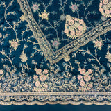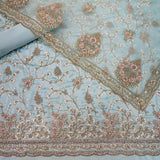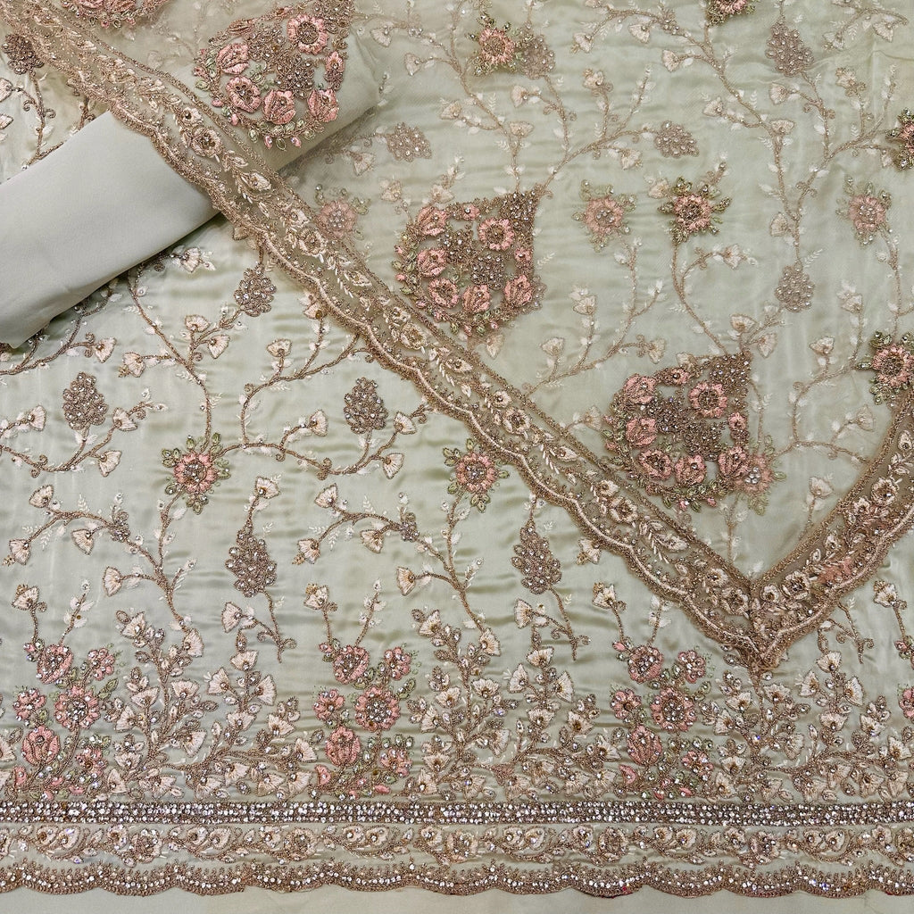 ▪️Floral jaal embroidery with accents of contrast threadwork, light gold dori work and stonework