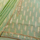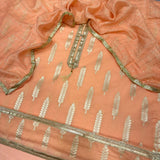 ▪️Unstitched faux soft benarsi silk suit with a neck design which features gold embroidery and sippi work with buttons
