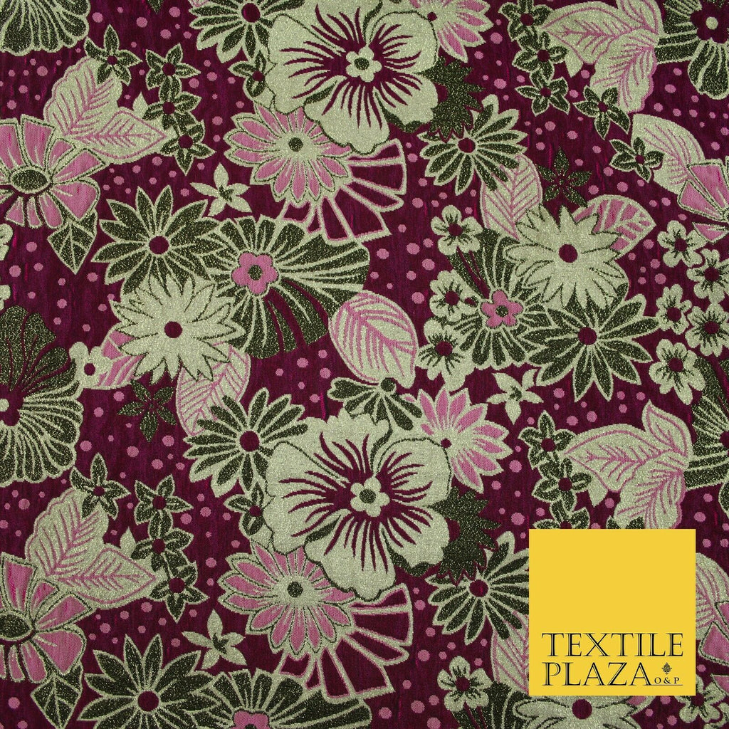 Magenta Pink Antique Gold Tropical Floral Dot Textured Brocade Dress F