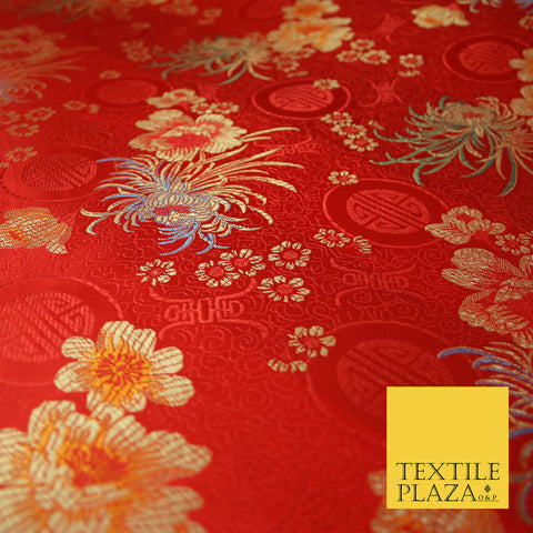 RED Oriental SHOU Floral Chinese Brocade Satin Embroidered Dress Fabric 3523