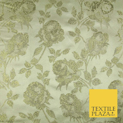 Cream Gold Mint Green Blooming Leafy Rose Flowers Brocade Jacquard Fabric 6787
