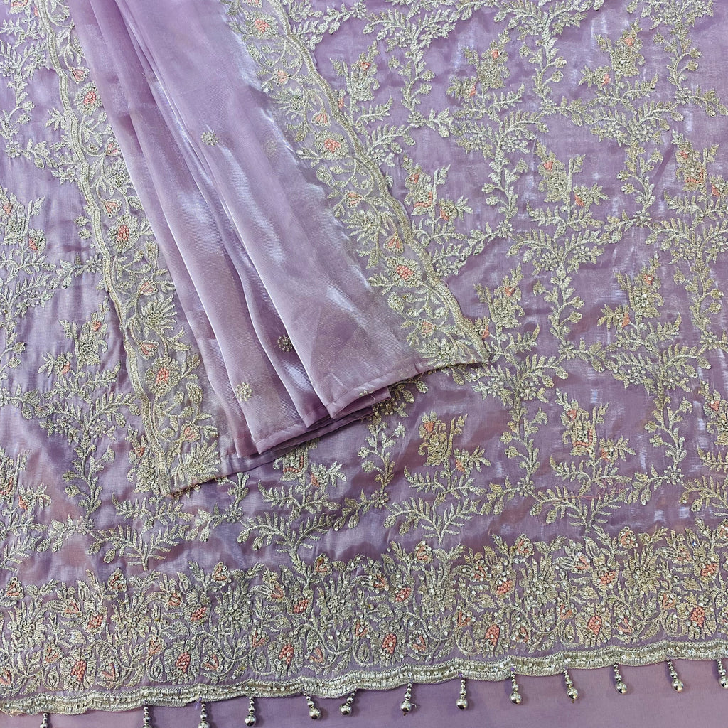 ▪️Embellished with jaal contrast threadwork embroidery with crystal stonework all over & a heavy border finished with tassels