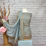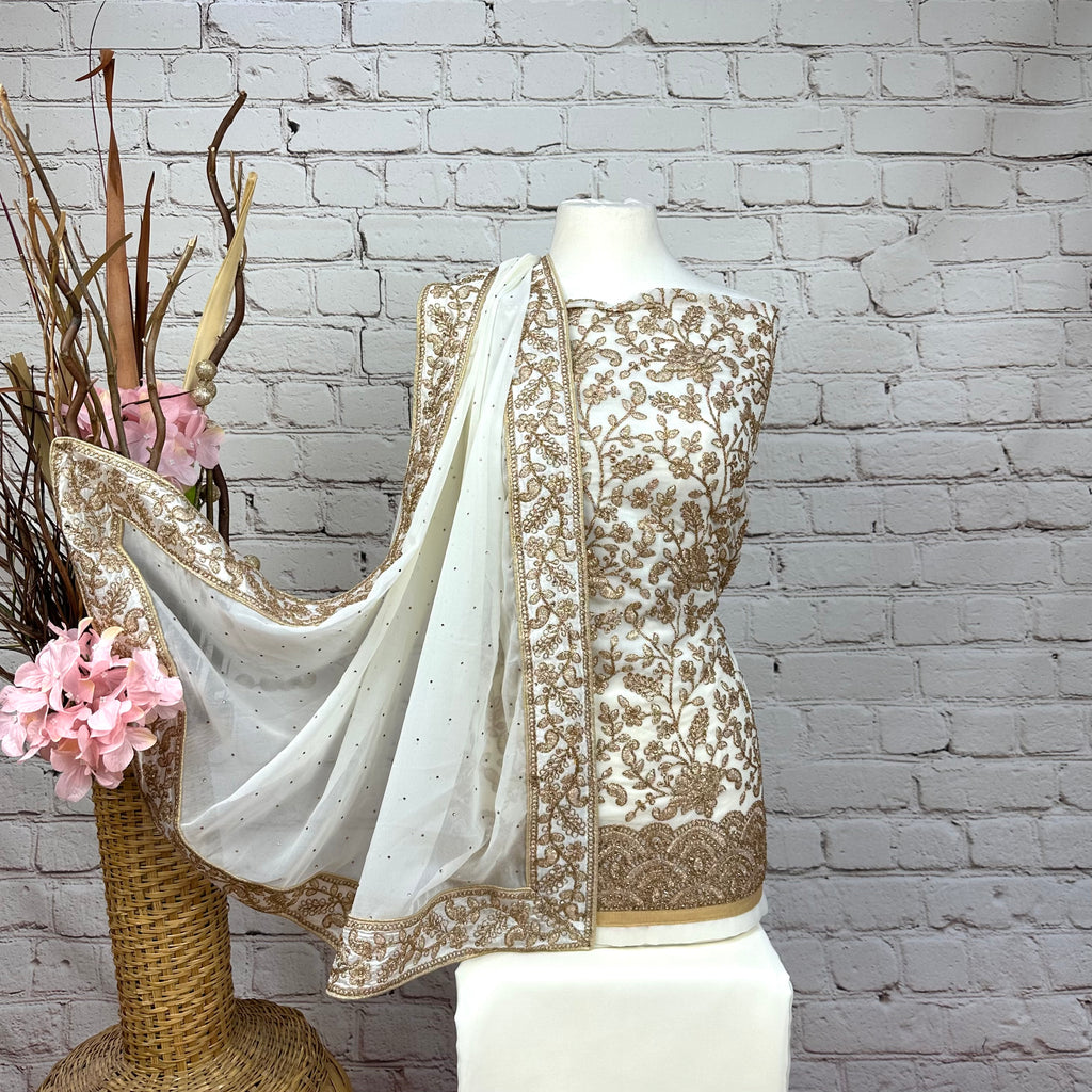 ▪️Unstitched soft georgette suit with jaal floral embroidery embellished with gold stones all over with heavy border