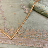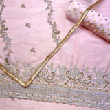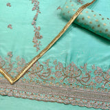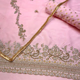 ▪️Unstitched soft faux raw silk suit embellished with zardozi, dori work & stonework with a subtle scalloped border