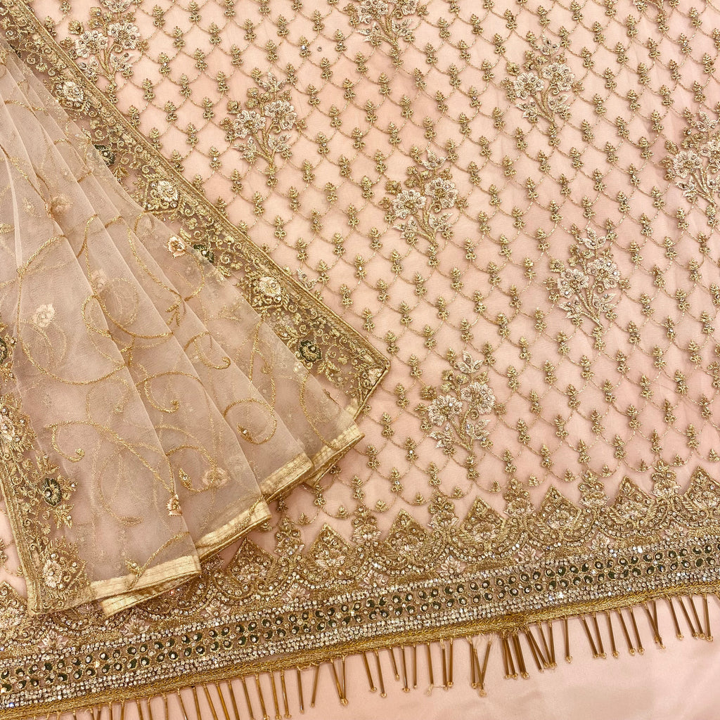 ▪️Self floral thread-work embroidery with stonework all over & border with gold tassel trimming