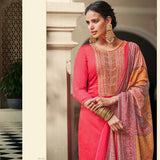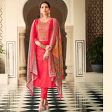 ▪️Unstitched bright-coral pure satin silk cotton kameez with cording embroidery on neck