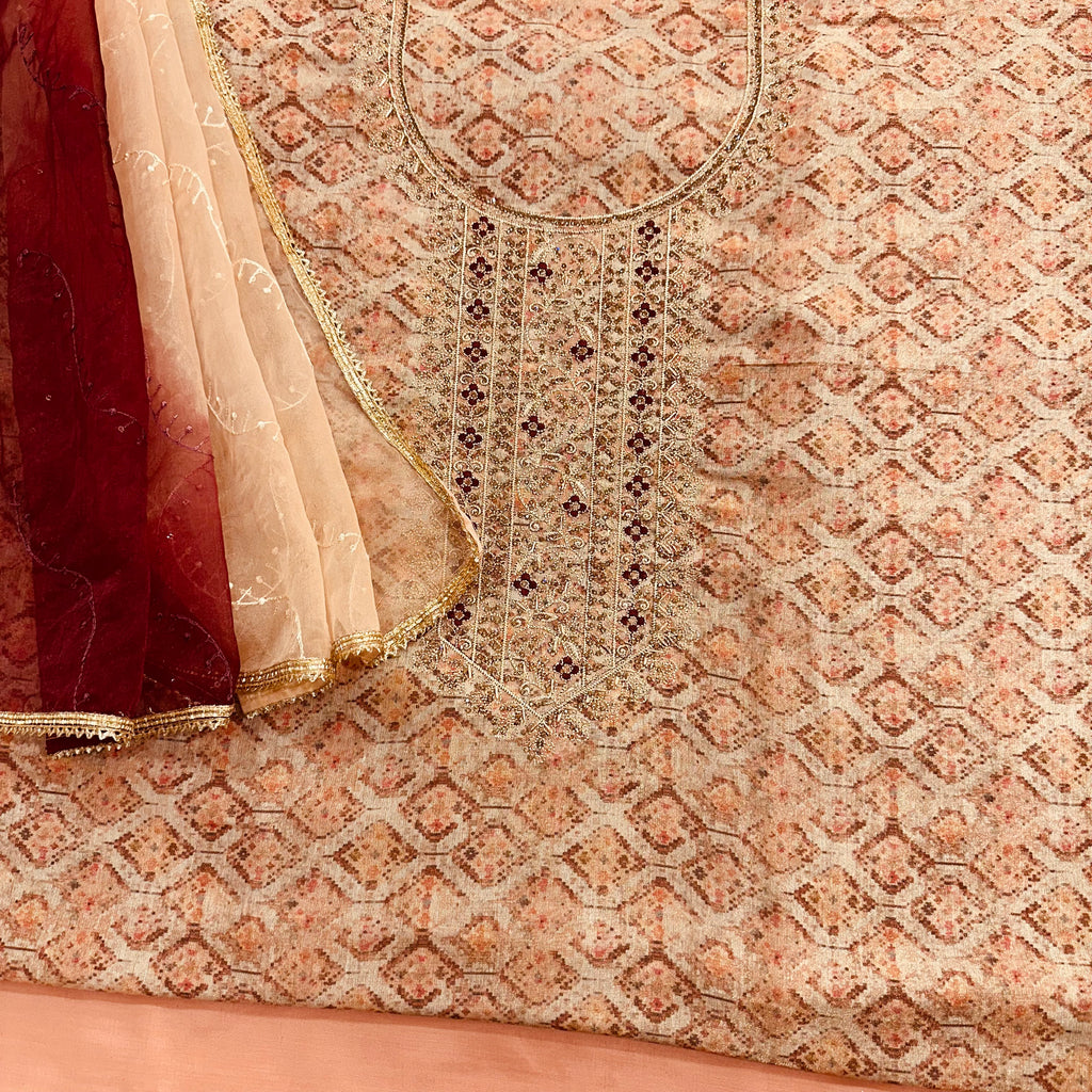▪️Faux soft digital printed organza suit with neck design which features antique stonework & border