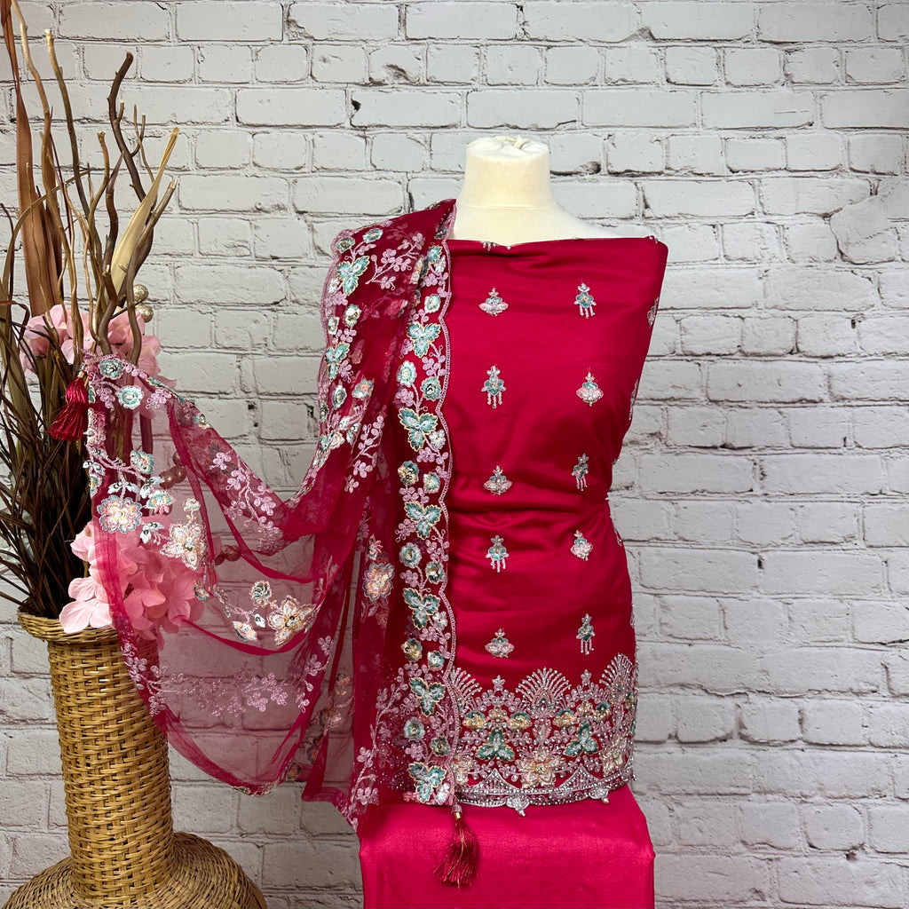 ▪️Unstitched tulle net suit with contrast threadwork floral embroidery