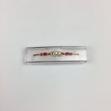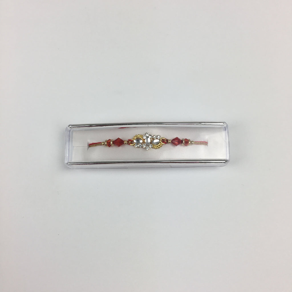 Single Diamond Shaped Silver Stoned Rakhi With Red Beads - R108