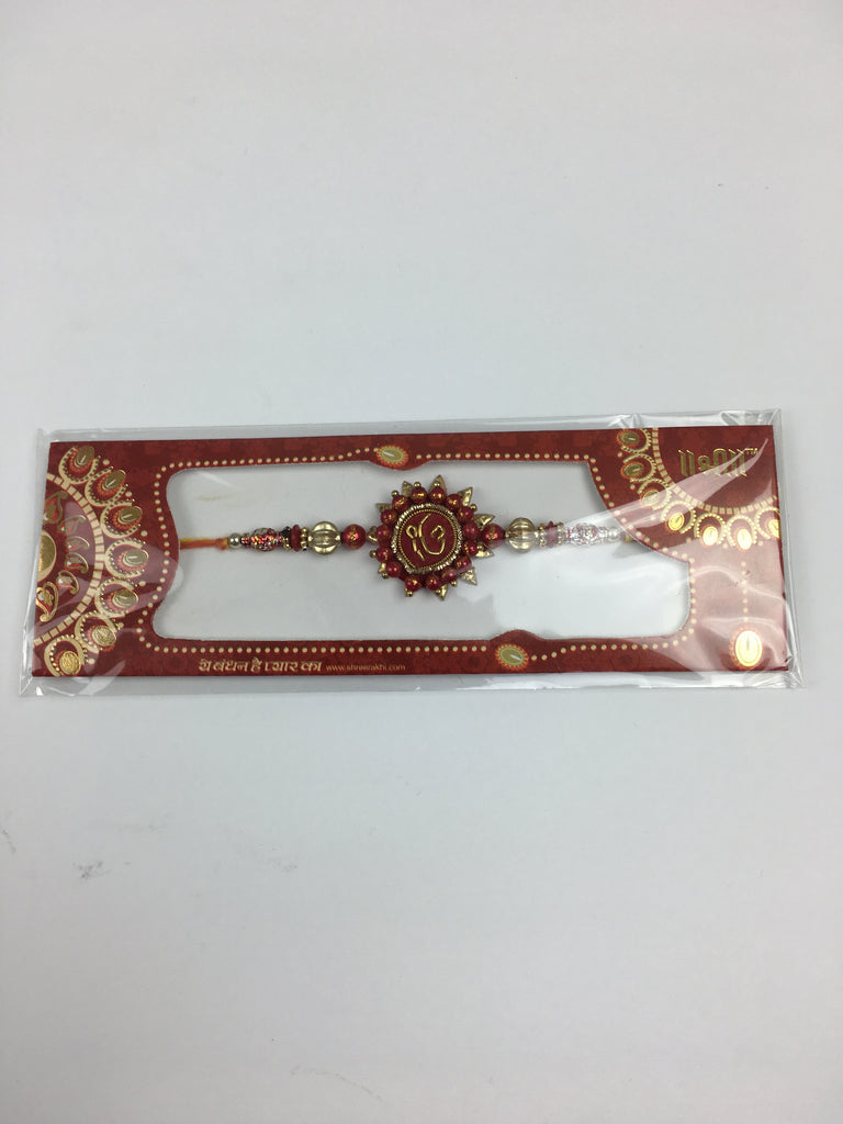 Single Red And Gold fabric Ik Onkar Rakhi With Orange Thread - R118
