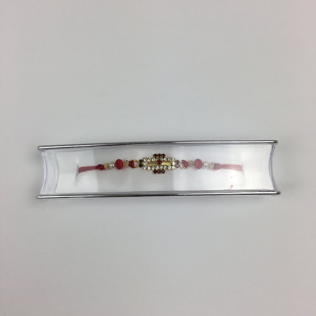 Single Red Thread Gold Cross Shaped Rakhi With Pearls -R106