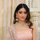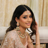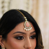 Statement kundan effect 3 piece set with peach stones. Item comes with matching earrings and tikka.
