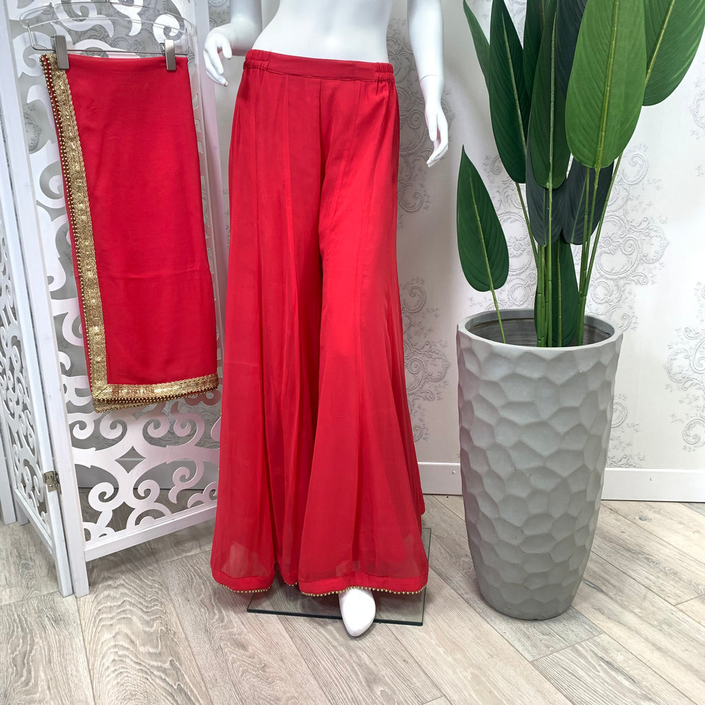 Featuring a gold trim at the bottom of the Sharara and the four sides of the Duputta. This design is the perfect addition to your outfit for that next function / event!