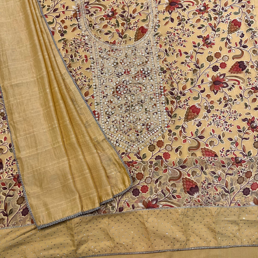 ▪️Unstitched soft faux brasso suit with an embroidered intricate neck design which features sippiwork with border