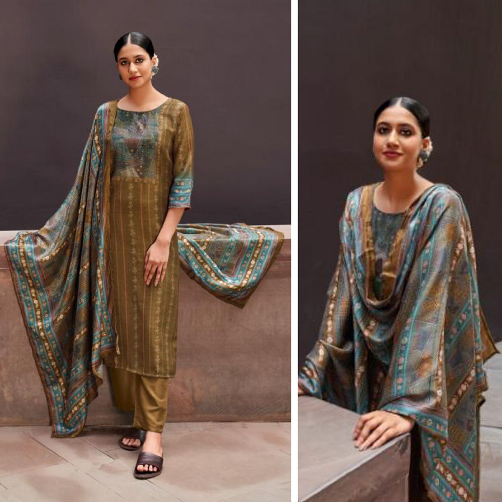 ▪️Olive digital printed pashmina suit with knot work detailing