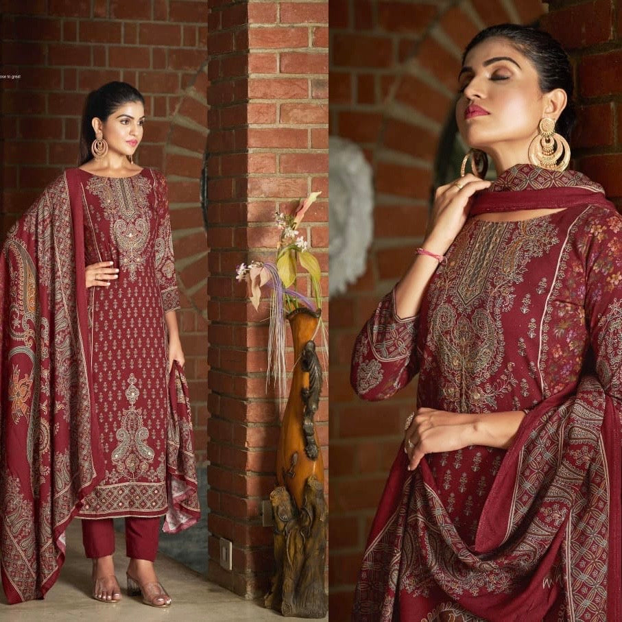 ▪️Maroon pure pashmina suit with digital print all over