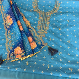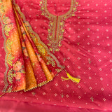▪️Unstitched soft faux bandhani silk suit with an intricate neck design which features antique stonework, sippi work & threadwork embroidery with border