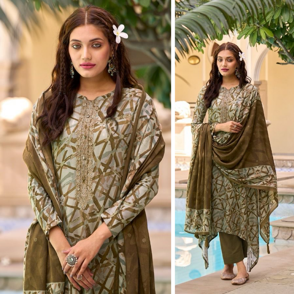 ▪️Designer Khaki pashmina abstract digital print with threadwork embroidery on neck