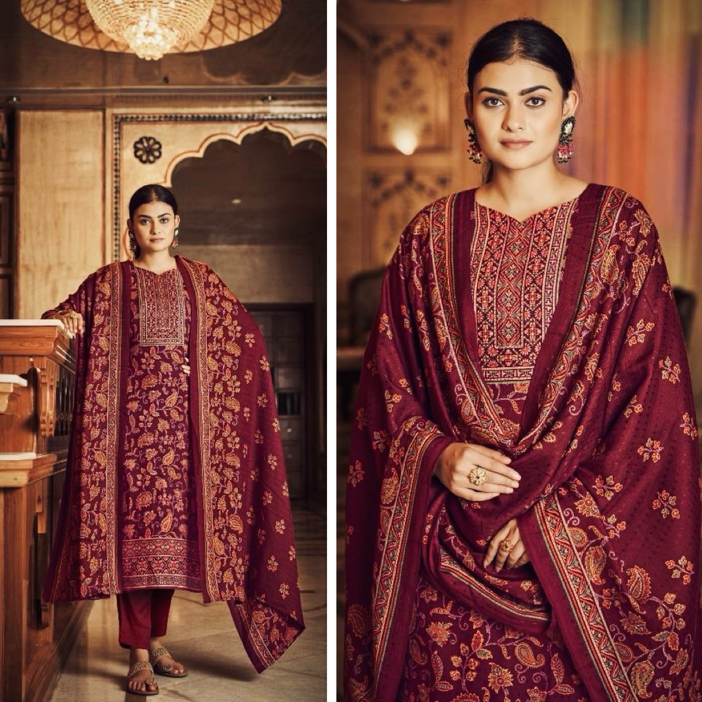 ▪️Designer maroon pure pashmina print with swarovski work on neck