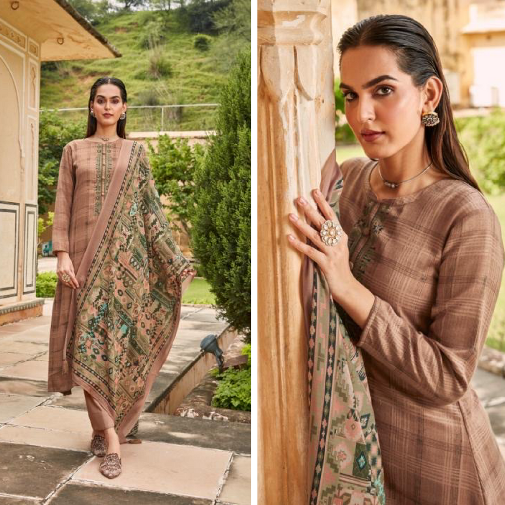 ▪️Light Copper pashmina suit with digital print all over & embroidered neck design