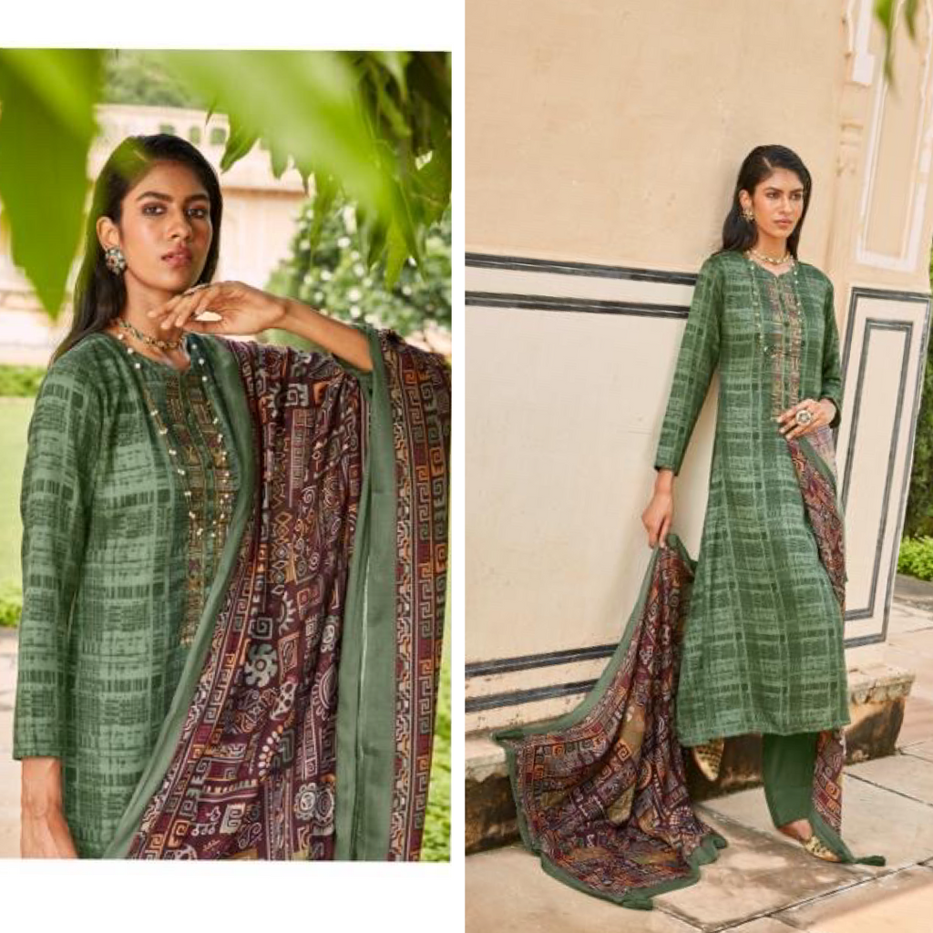 ▪️Green pashmina suit with digital print all over & embroidered neck design