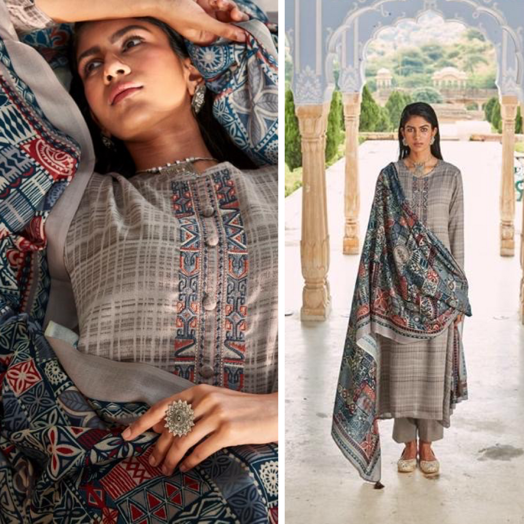 ▪️Grey pashmina suit with digital print all over & embroidered neck design