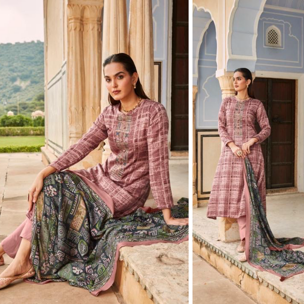 ▪️Dusty Pink pashmina suit with digital print all over & embroidered neck design