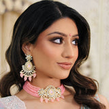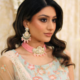 3 piece baby pink stone choker set. Item comes with matching earrings and tikka.